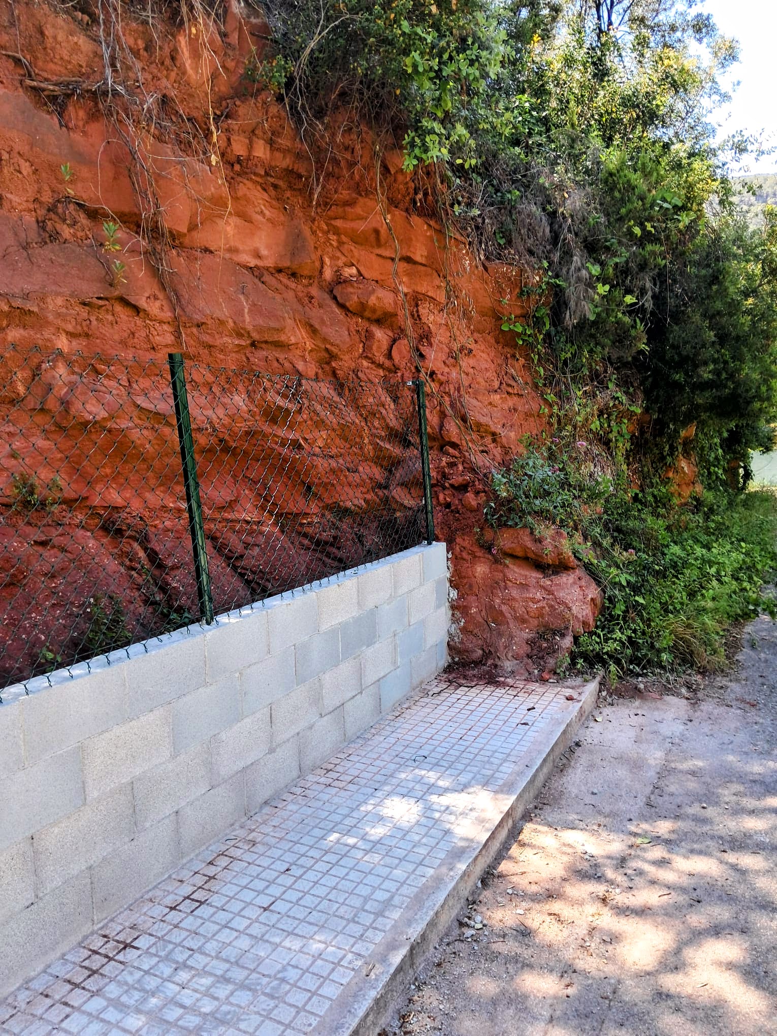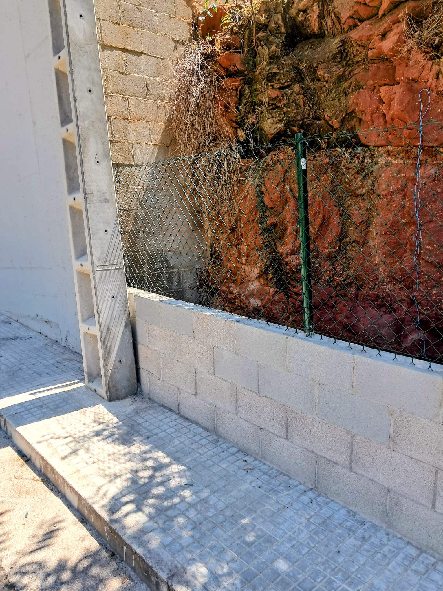 Construcción de muro exterior con rejilla metálica en Barcelona, asegurando resistencia y durabilidad.